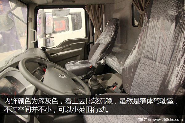 内饰颜色为深灰色,简洁易用,看上去比较沉稳,虽然是窄体驾驶室,不过空间并不小,视野也很开阔,在里面可小范围活动。