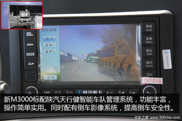 新M3000标配陕汽天行健智能车队管理系统,功能丰富,有定位、运营管理、故障检测等应用程序,操作简单实用。同时配有倒车影像系统,大大提高倒车安全性。