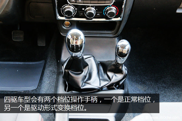 车内还有一键升降功能电动车窗、电动调节后视镜、大灯亮度调节等功能,中控锁也属于标准配置。四驱车型会有两个操纵挡杆,一个是变速箱操纵挡杆,另一个是分动器的操纵挡杆,用来实现两驱和四驱的切换。