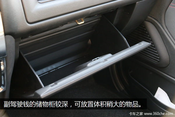 轿车化的内饰提供了不少储物空间。车门处有储物槽,可放置水杯。在主副驾之间有四个小型储物凹槽和一个稍大的储物柜可放置杂物,副驾驶前侧也有储物槽和储物柜。丰富的储物空间十分必要。