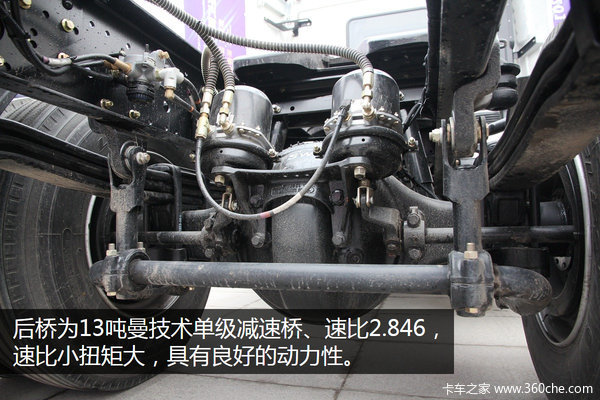 后桥为13吨曼技术单级减速桥、速比2.846,传动效率高,承载能力强。