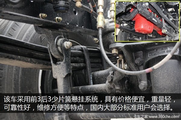 该车采用前3后3少片簧悬挂系统,价格便宜,重量轻,可靠性好,维修方便,国内已经很普遍了,很多用户都在使用。