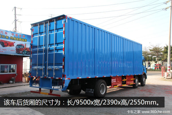 该车货厢的尺寸为:长/9500x宽/2390x高/2550mm,货厢四周下方设有保险杠、后尾杠,而且采用鲜艳的颜色来涂装,便于后方车辆辨识,防钻入保险杠和后尾杠另一个特点就是如果出现意外被追尾了,能够最大限度下保证小型汽车不会钻入底盘,降低司机受伤风险。