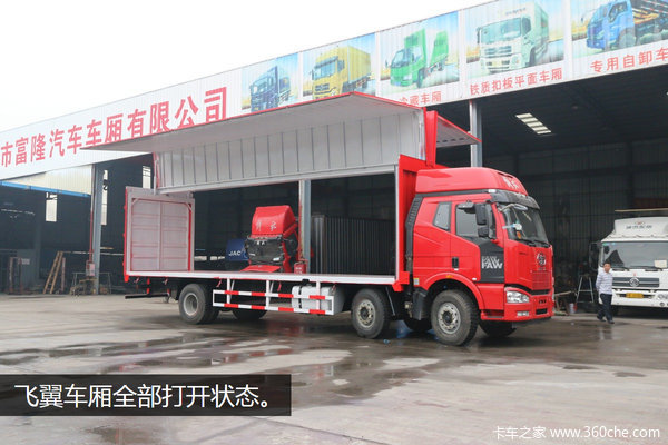 这款飞翼货箱是有广州市富隆车厢厂打造的,是基于解放J6M 6x2重卡底盘开发制造。从外观上看,飞翼货厢与一般货厢的差别并不大,需要细心留意才能发现飞翼货厢的侧面下方多了几个保险扣。