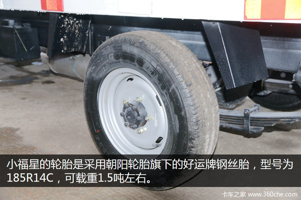 这款小福星载重1.5吨左右,采用的是后单胎设计,轮胎为朝阳轮胎旗下的好运牌钢丝胎,型号为185R14C,满足轻载物流需求。