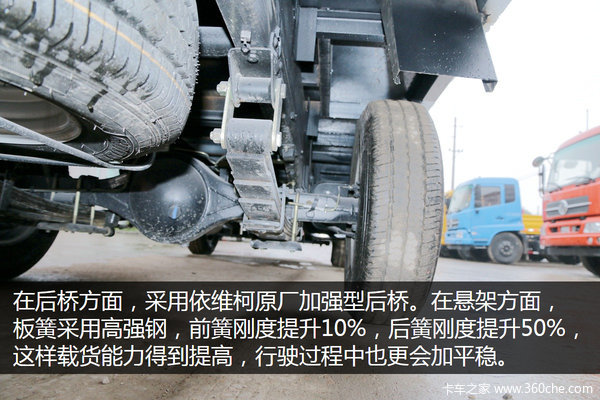 在后桥方面,小福星S50Q采用依维柯原厂加强型后桥。悬架板簧采用高强度钢,前簧刚度提升10%,后簧刚度提升50%,这样载货能力得到提高,行驶过程中也更会加平稳。