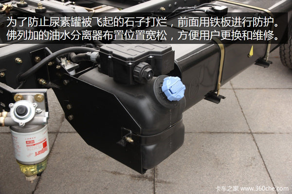 尾气处理采用了SCR的形式,尿素罐和油箱布置在车辆的左侧。尿素罐的周围用铁板进行了保护能够防止尿素罐被损坏。弗列加的油水分离器布置的位置前后非常宽松,方便用户泵油以及更换。