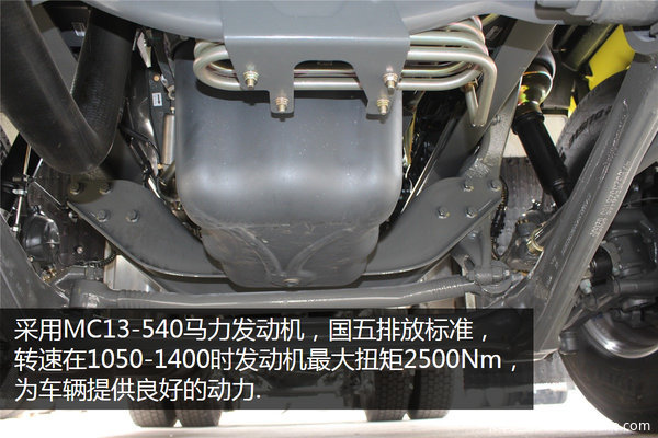 该车采用MC13-540马力发动机,国五排放标准,发动机与德国曼同步生产,B10寿命可达150万公里,8万公里换油里程,单月平均运营里程3万公里,保障C7H高时效性,同时车辆转速在1050-1400时发动机最大扭矩2500Nm,为车辆提供良好的动力。