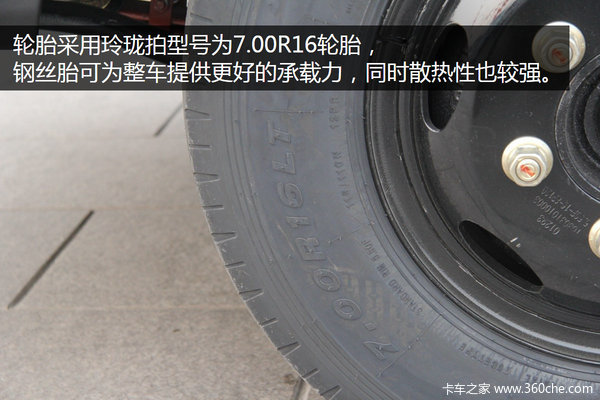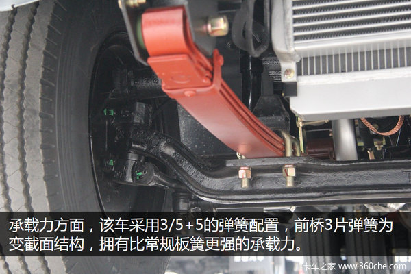 承载力方面,该车采用3/5+5的弹簧配置,前桥3片弹簧为变截面结构,比相同承载力的普通板簧质量更轻。轮胎采用玲珑牌型号为7.00R16轮胎,钢丝胎可为整车提供更好的承载力,同时散热性也较强。