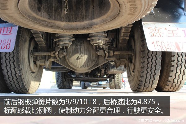 前后钢板弹簧片数为9/9/10+8,后桥速比为4.444,还可选择4.111速比,并在制动方面标配了ABS,保证汽车的制动方向稳定性,防止产生侧滑和跑偏,使车辆行驶更安全。