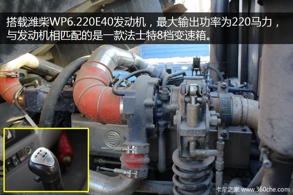 此款车搭载了潍柴WP6.220E40发动机,6.75L排量最大输出功率为220马力,最大扭矩850牛米,满足国四排放标准。
