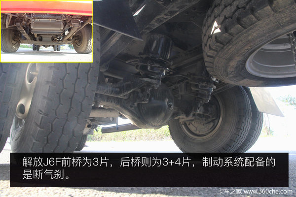 解放J6F搭载排量为3.0升的大柴道依茨4DD1发动机,最大功率130马力,最大扭矩320牛米。匹配5档手动变速箱。由于该车的自重达到了3.5吨,加速测试中受到明显影响,0-60加速时间为12.27秒,加速距离为127.48米,表现一般。由于该车采用的是气压制动,制动灵敏,但前轮制动比较粗暴,跑偏现象严重,制动性能感受不好。