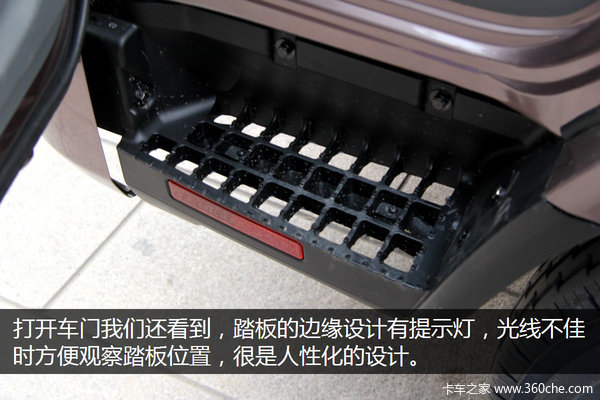 唐骏K3驾驶室的空间很大,标配耐脏的深色内饰,座椅采用织物材料。打开车门我们还看到,踏板的边缘设计有转向灯,镂空的踏板可以减少鞋底的污物被带入驾驶室内。