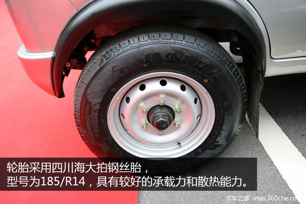 双排瑞宝微卡采用后单胎形式,承载力比双胎形式差了一些,但也减少了滚动摩擦阻力,降低了油耗,轮胎采用四川海大牌钢丝胎,型号为185/R14,具有较好的承载力和散热能力。