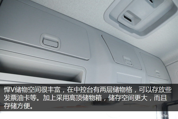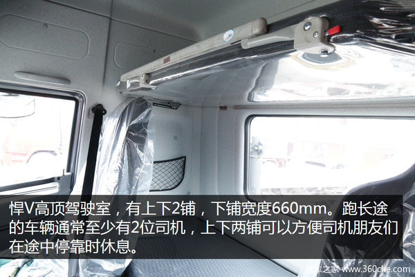 悍V高顶驾驶室,有上下2铺,下铺宽度660mm。跑长途的车辆通常至少有2位司机,上下两铺可以方便司机朋友们在途中停靠时休息。