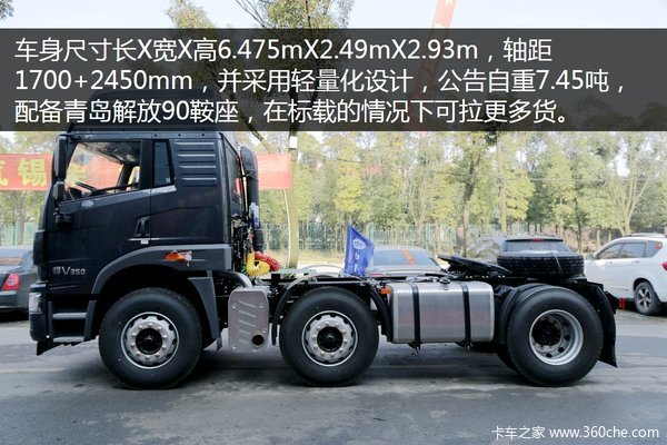 悍V 6X2 350马力牵引车车身尺寸长x宽x高 6.475mx2.49mx2.93m,轴距1700+2450mm。悍V采用轻量化设计,公告自重7.45吨,配备青岛解放90#鞍座,在标载的情况下可拉更多货。