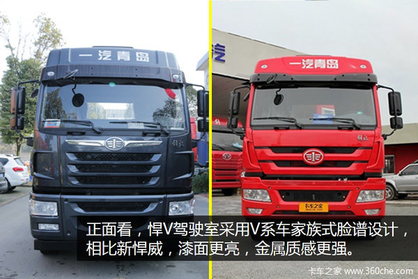 正面看,悍V驾驶室采用V系车家族式脸谱设计,相比新悍威,漆面更亮,金属质感更强。