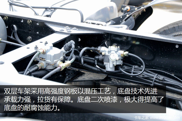 双层车架采用高强度钢板以混压工艺,底盘技术先进承载力强,拉货有保障。底盘二次喷漆,使得底盘的耐腐蚀能力得到极大的提高。