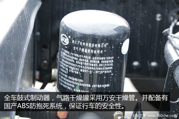 悍V全车采用鼓式制动器,并配备有国产ABS防抱死系统,保证行车的安全性。气路干燥罐采用万安干燥罐,万安干燥罐属于国产品牌中优良产品,深受用户信任。