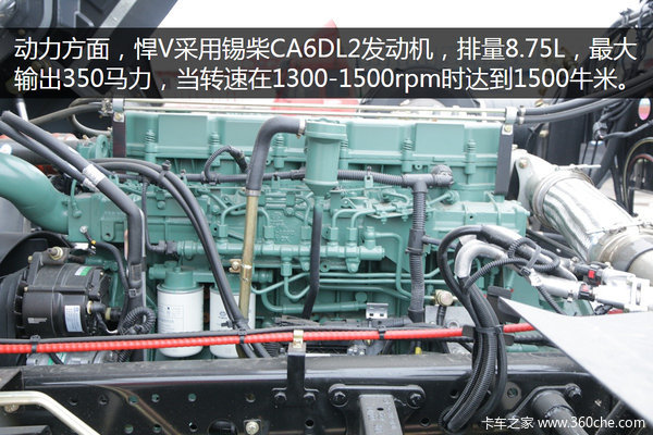 动力方面,悍V采用锡柴CA6DL2发动机,排量8.75L,最大输出350马力,当转速在1300-1500rpm时达到最大扭矩1500牛米。