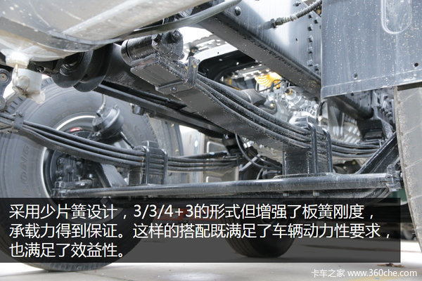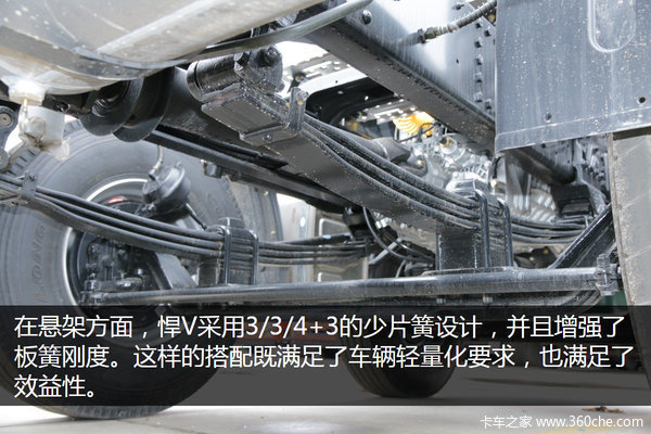 在悬架方面,悍V采用3/3/4+3的少片簧设计,并且增强了板簧刚度。这样的搭配既满足了车辆轻量化要求,也满足了载重性能。