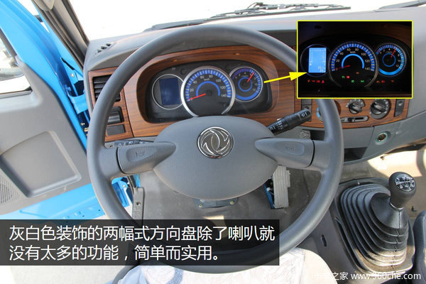 灰白色装饰的四幅式方向盘除了喇叭就没有太多的功能,两小一大的仪表盘采用黑底搭蓝色装饰,功能虽然不多但却简单而实用。