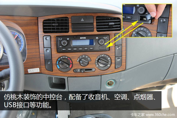 简洁的中控台,配备了收音机、空调、点烟器、USB接口等功能。驾驶员在行车过程中可以收听自己喜欢的电台。