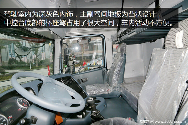 驾驶室内为深色内饰,空间有点小,主副驾中间地板为凸状设计,中控台底部的杯座占用了很大空间,车内活动不方便。