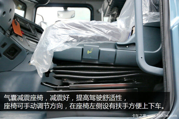 采用气囊减震座椅,减震好,提高驾驶舒适性,座椅可手动调节方向,在座椅右侧设有扶手方便上下车。