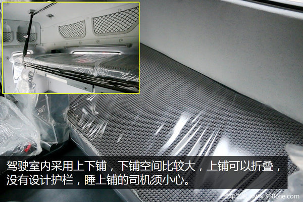 驾驶室内采用上下铺,下铺空间比较大,上铺可以折叠,设有护栏,更好的保护上铺休息人员。