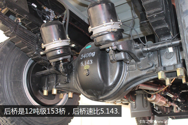 该车采用12吨级153后桥,承载力强,后桥速比5.143,采用气刹,装有ABS系统,更加安全,并且该型号车桥技术成熟,不易损坏,方便维修。153车桥是制造工艺非常成熟的车桥,曾经服役于东风八平柴经典载货车上,后来天锦等载货车都借鉴了153车桥的技术。