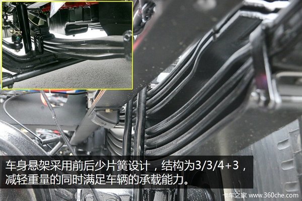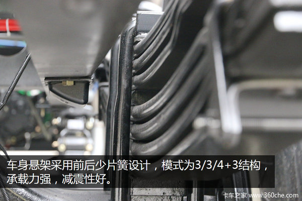 车身前后悬架采用钢板片簧设计,结构为3/3/4+3,减轻车身重量的同时满足车辆的承载能力。