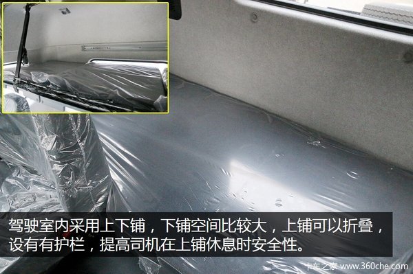 驾驶室内采用上下铺,下铺空间比较大,上铺可以折叠,设有护栏,保证上铺休息的司机安全。