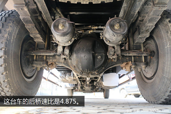 这台车的前后悬挂用的是常见的钢板弹簧结构,弹簧板数为7/7+6,搭配上双层式大梁,保障了车身足够的承载能力。前轮还可以看到采用的是盘式制动,采用这种方式的成本比鼓式要高,但是散热性能要好很多,安全性很高,危险品运输车都会采用前盘后鼓式制动。