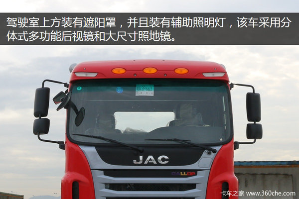 驾驶室上方装有遮阳罩,并且装有示廊灯。驾驶室顶部两边配备有两个气动喇叭。该车采用分体式多功能后视镜和大尺寸照地镜,为司机提供更好的视野。