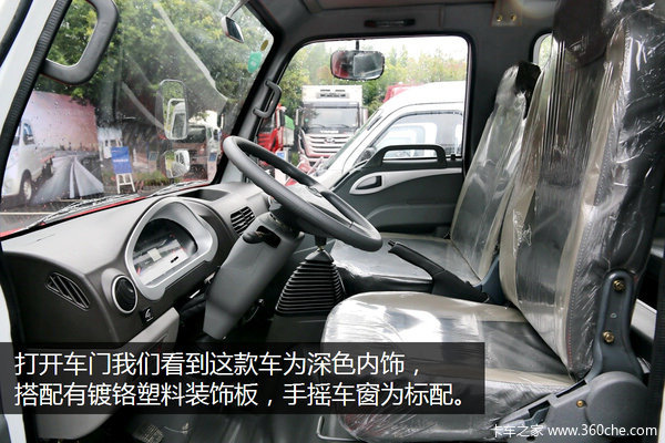打开车门我们看到这款车为深色内饰,搭配有浅色塑料装饰板,手摇车窗为标配。驾驶室距离地面不高,但也安装了一阶踏板,上下车也能省力一些。