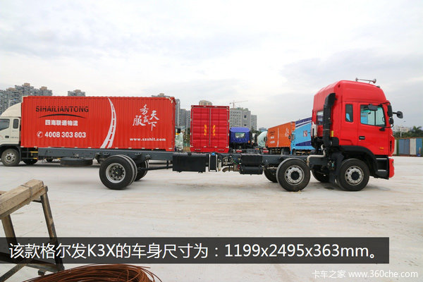 该款格尔发K3X的车身尺寸为:11990x2495x3630mm,装9米6的货箱。