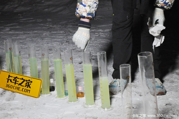 在策划此次抗凝剂测试之初,我们本以为可以在北京完成,事先装了一小瓶0号柴油样品放在室外冷冻一晚。第二天早晨起来观察发现柴油并没有任何挂蜡的情况,通过测试,也可以看出来,以北京现在夜晚零下7-8度的气温,即使0号柴油也完全用不到抗凝剂。
