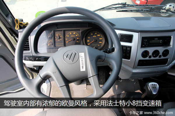 驾驶室内部的布置和仪表也是浓郁的欧曼风格,显示出福田擅长的拿来主义。法士特小8挡变速箱是亮点,低速重载和高速巡航都靠它。