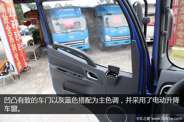 凹凸有致的车门以灰白色为主色调,采用的电动升降车窗,使用起来会比一般轻卡的手摇式升降车窗更为便捷。同时车门上还装有储物格和烟灰缸,便于驾驶员放置物品和弹放烟灰。