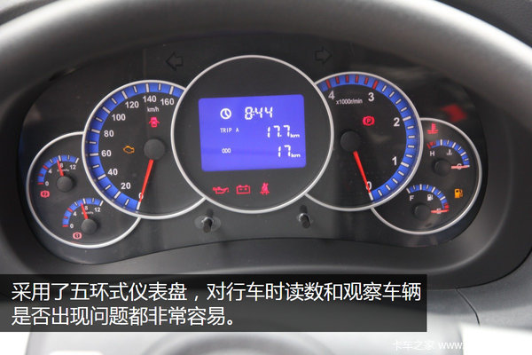 仪表盘采用五环形式设计,中间的液晶屏能够提供时间显示、里程数、功能丰富。车上如果未系安全带,车门未关闭都会有所提示,比较人性化。