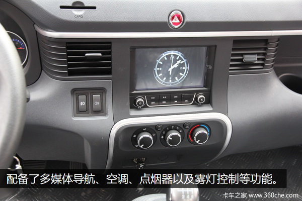 中控台装饰的很美观,配备了车载多媒体触控系统、空调、点烟器以及雾灯控制等功能。在多媒体上方是一个危险开关按扭,红色的装饰非常醒目。其中车上安装的多媒体触控系统,车辆启动后的多媒体上是以时钟的形式显现,打开后才能显示有哪些功能。除了导航和收音机功能等基本配置以外,连接上手机蓝牙后放音乐、打电话都可以。