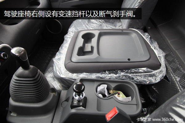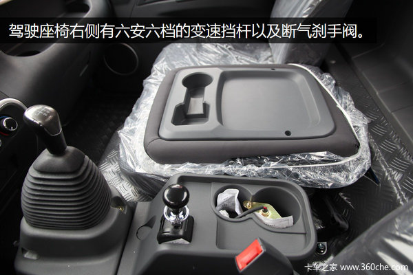驾驶座椅右侧设有变速挡杆以及断气刹手阀,并且手阀旁边带有杯托和储物格。中间的座椅折叠后设有一个杯托和储物格,方便车内人员放置水杯和物品。