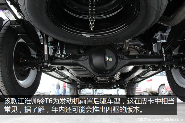 该款江淮帅铃T6为发动机前置后驱车型,这在皮卡中相当常见,据经销商介绍,年内应该会推出四驱的版本,让江淮帅铃T6能适合更多的路况,同时也提供更多选择给用户。