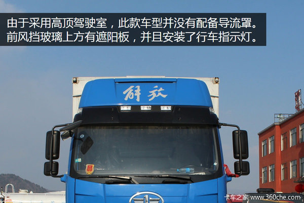 由于此款车型采用了高顶驾驶室,驾驶室车顶已经与货箱基本同高,所以厂家没有选配导流罩。前风挡玻璃处有遮阳板设计,可以避免司机在逆光行驶时强光直射眼睛,从而造成的视线模糊,影响行车安全。
