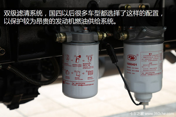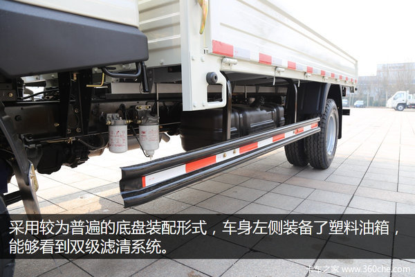 采用较为常见的底盘布置形式,车身左侧装备了塑料油箱,能够看到双级滤清系统,国四以后很多车型都选择了这样的配置,以保护昂贵的发动机燃油供给系统。