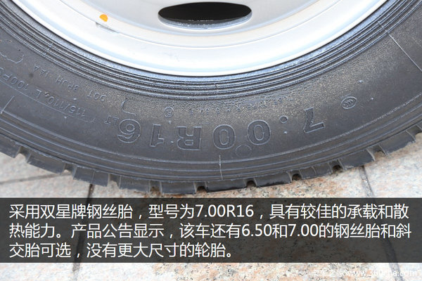 承载力配置上,载重设计趋向于标载,轮胎采用双星牌钢丝胎,型号为7.00R16,具有较佳的承载和散热能力。产品公告显示,该车还有6.50和7.00的钢丝胎和斜交胎可选,没有更大尺寸的轮胎。