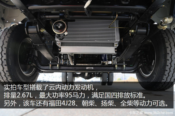 动力方面,实拍车型搭载了云内动力发动机,排量2.67L,最大功率95马力,满足国四排放标准。云内发动机在经济型轻卡上的搭载率越来越高,好多品牌具有搭载云内动力的整车,其品质由此可见一斑。传动系统匹配了五档变速箱,后桥速比5.375。