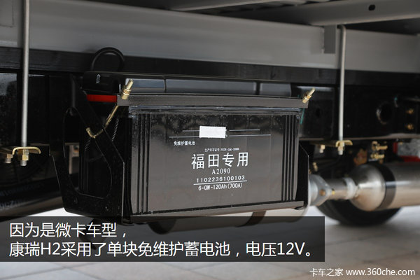 与很多轻卡类似,康瑞K2采用了双级滤清系统,装备了较大容量的塑料油箱。因为是微卡车型,这辆车采用了单块免维护蓄电池,电压12V。