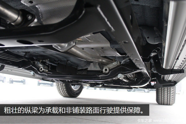 从车底看风骏5欧洲版的底盘,两根粗壮的纵梁支撑着整个车身,底盘有大梁的汽车走在烂路上的表现是承载式车身无法比拟的,承载能力更不用说。